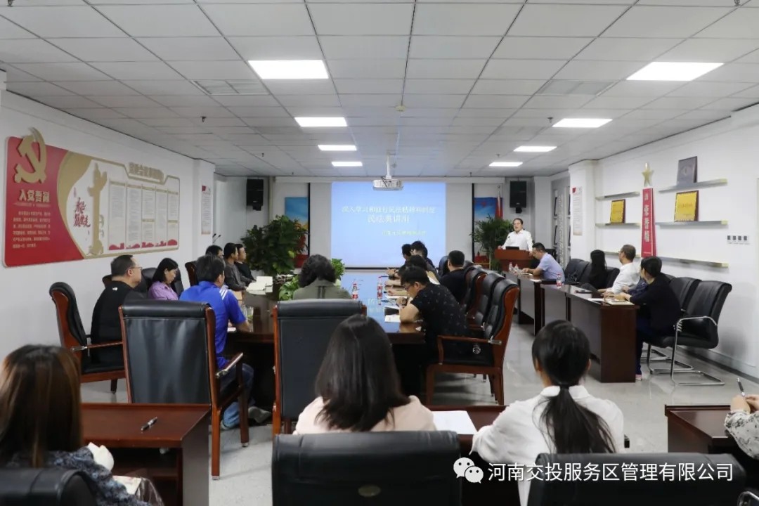 9月30日,為學習貫徹習近平總書記在中央政治局第二十次集體學習時有關實施民法典的重要講話精神,推動國有企業員工學法懂法、知法用法,公司邀請河南九同律師事務所主任楊偉授課,組織舉辦民法典學習講座。公司副總經理廖軍、副總經理夏磊、工會主席范東曉出席講座,公司機關各部室、文化傳媒公司近40余干部職工參加了此次講座。