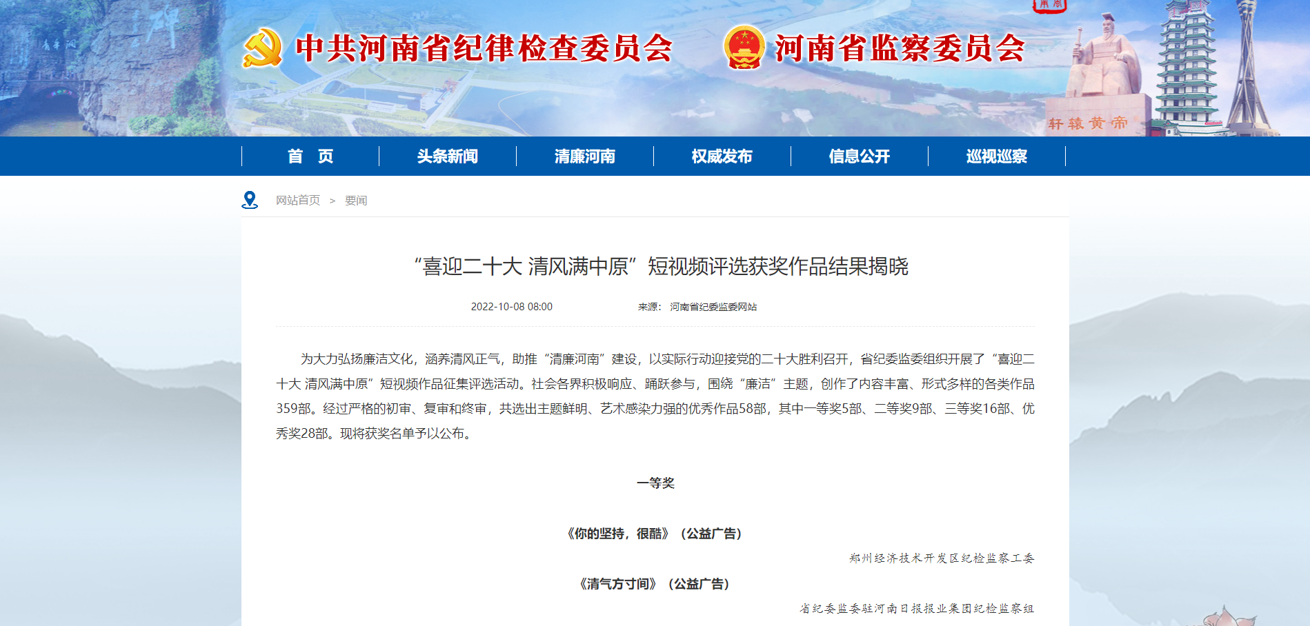 來源: 本站 發布時間: 2022-10-0810月8日,公司制作的短視頻《位子》,在河南省紀委監委組織開展的“喜迎二十大 清風滿中原”短視頻評選活動中榮獲三等獎!