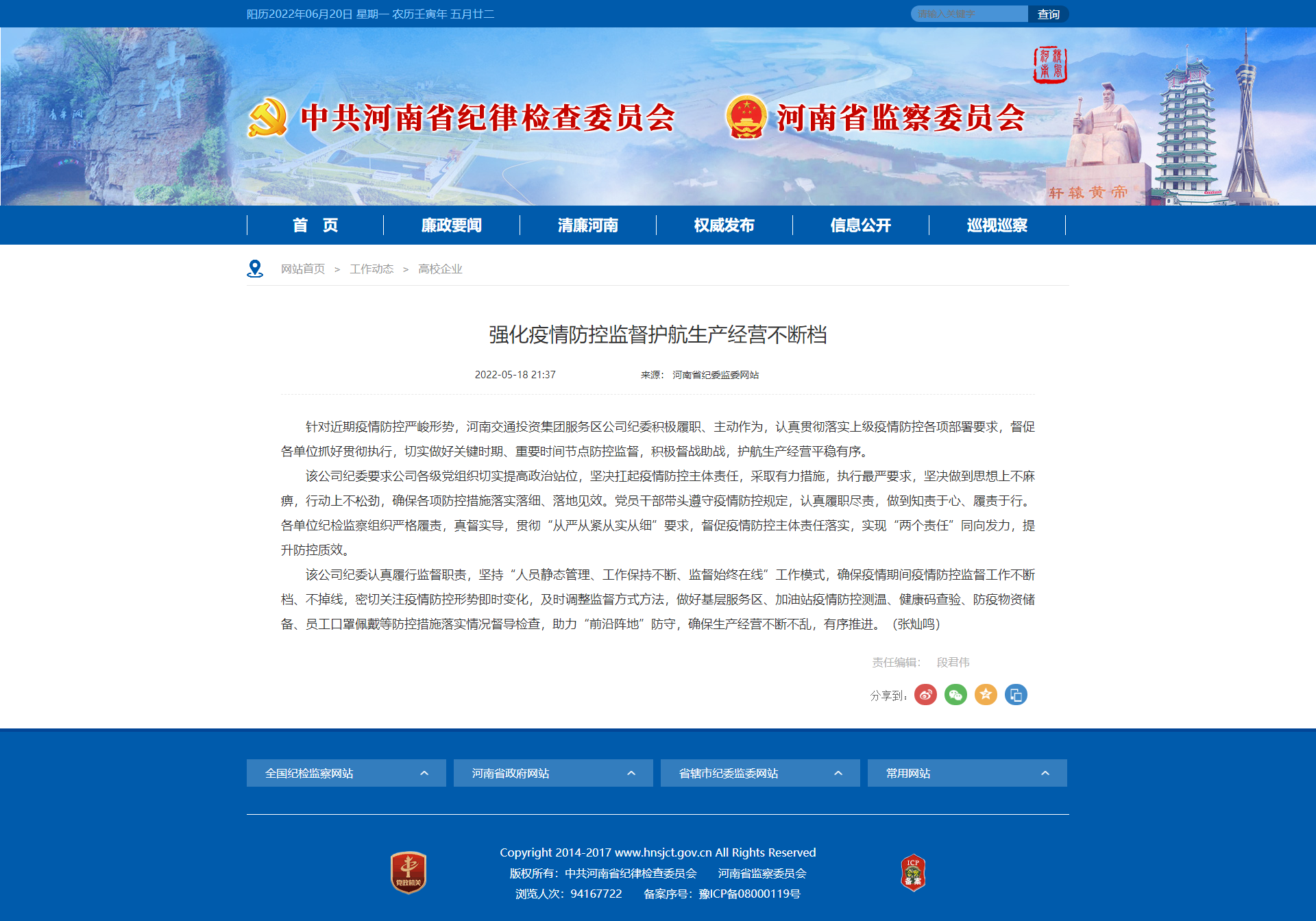 省紀(jì)委監(jiān)委網(wǎng)站刊載公司紀(jì)委工作信息《強(qiáng)化疫情防控監(jiān)督護(hù)航生產(chǎn)經(jīng)營(yíng)不斷檔》