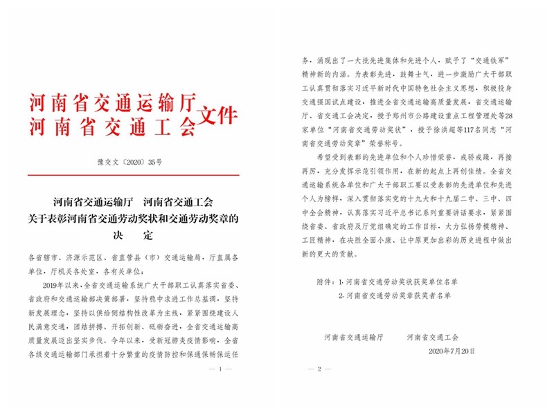喜訊!公司榮獲“河南省交通勞動獎狀”